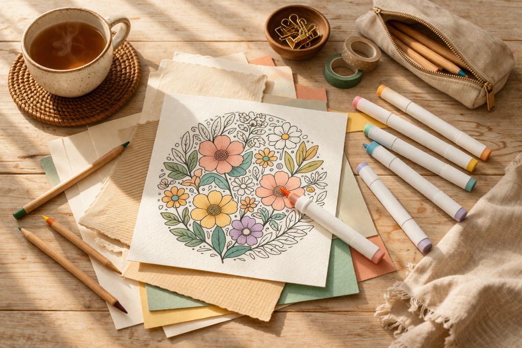 Parce que quand on débute, une question revient souvent : par où commencer ? Entre les feutres, les crayons de couleur, les papiers, les carnets illustrés… il est facile de se sentir un peu perdu — et de dépenser beaucoup pour finalement peu utiliser.